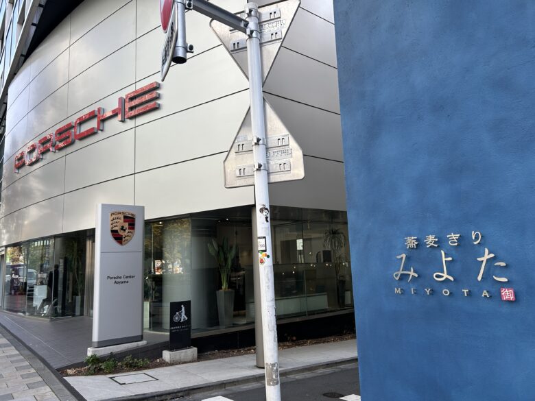 青山通りのポルシェセンター隣にある「蕎麦きり みよた」。
