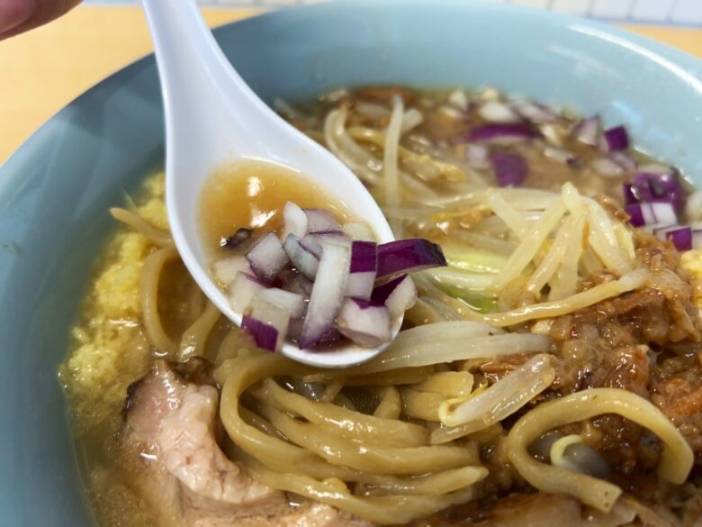 スープの旨みがダイレクトに伝わり、生姜と紫玉ねぎの爽やかさが際立つ。