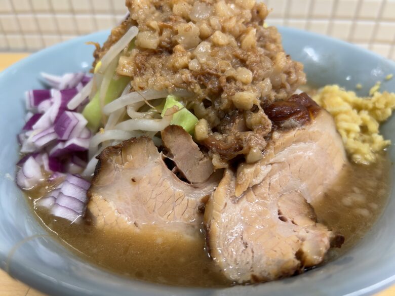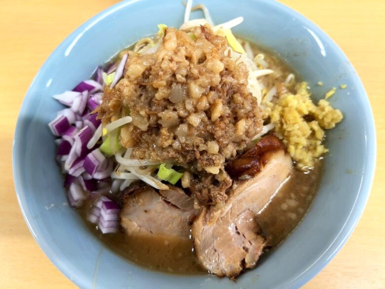ミニラーメン(麺200g)、野菜マシ、にんにく抜き、肉あぶら普通、生姜+紫玉ねぎトッピング